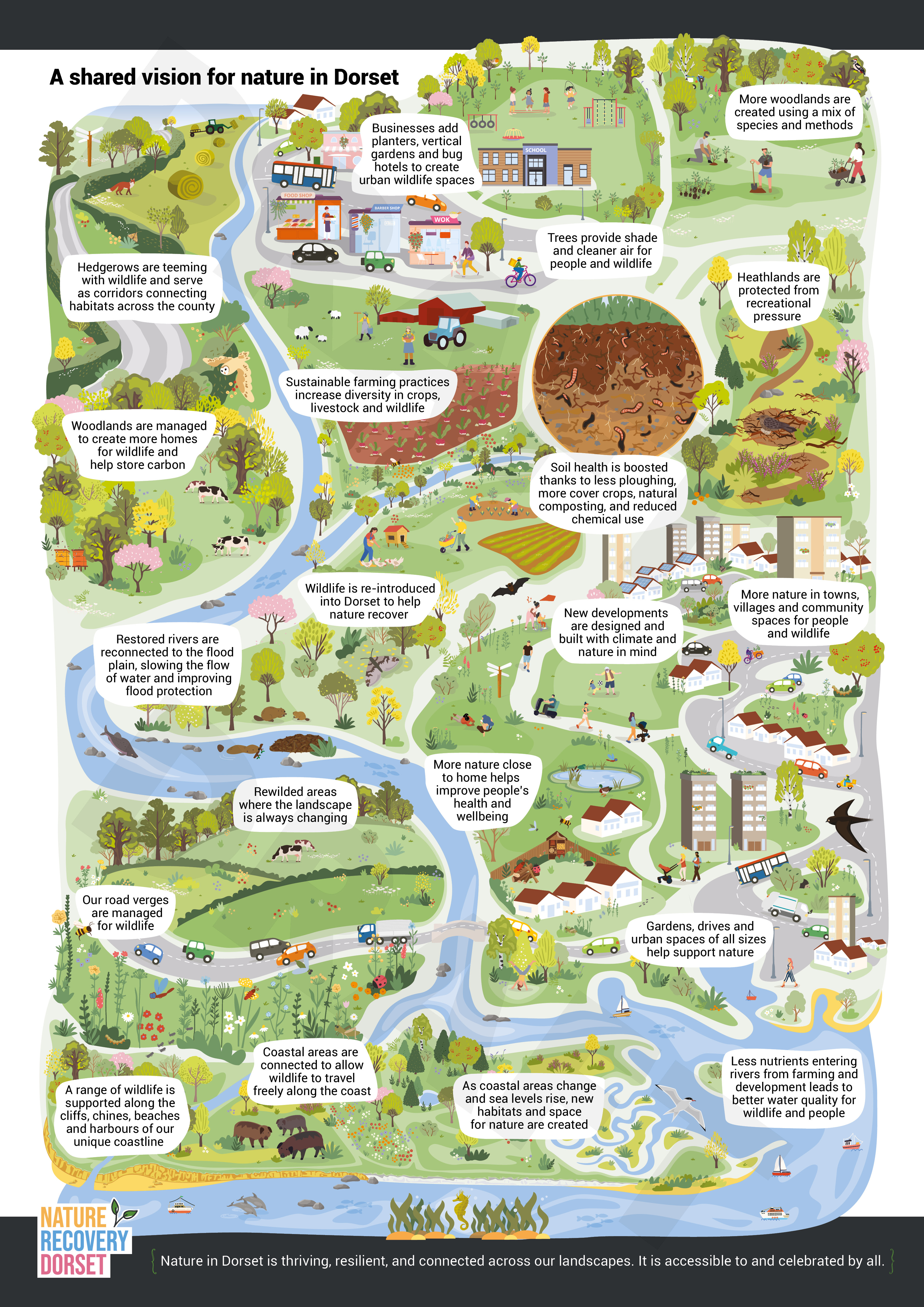 The Nature Recovery Dorset landscape illustrates the shared vision for nature recovery in Dorset. You can zoom in on the image by viewing it as a larger image.