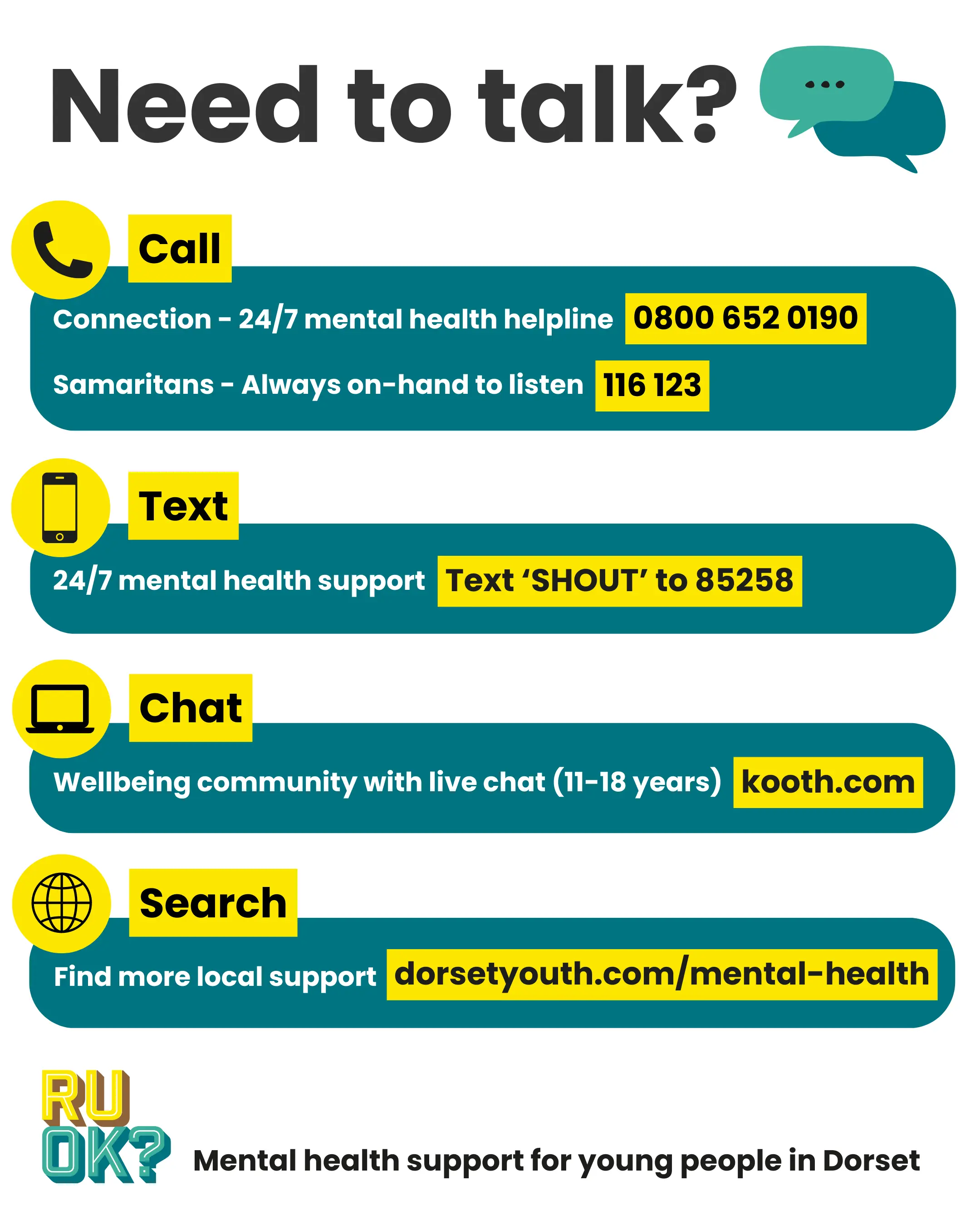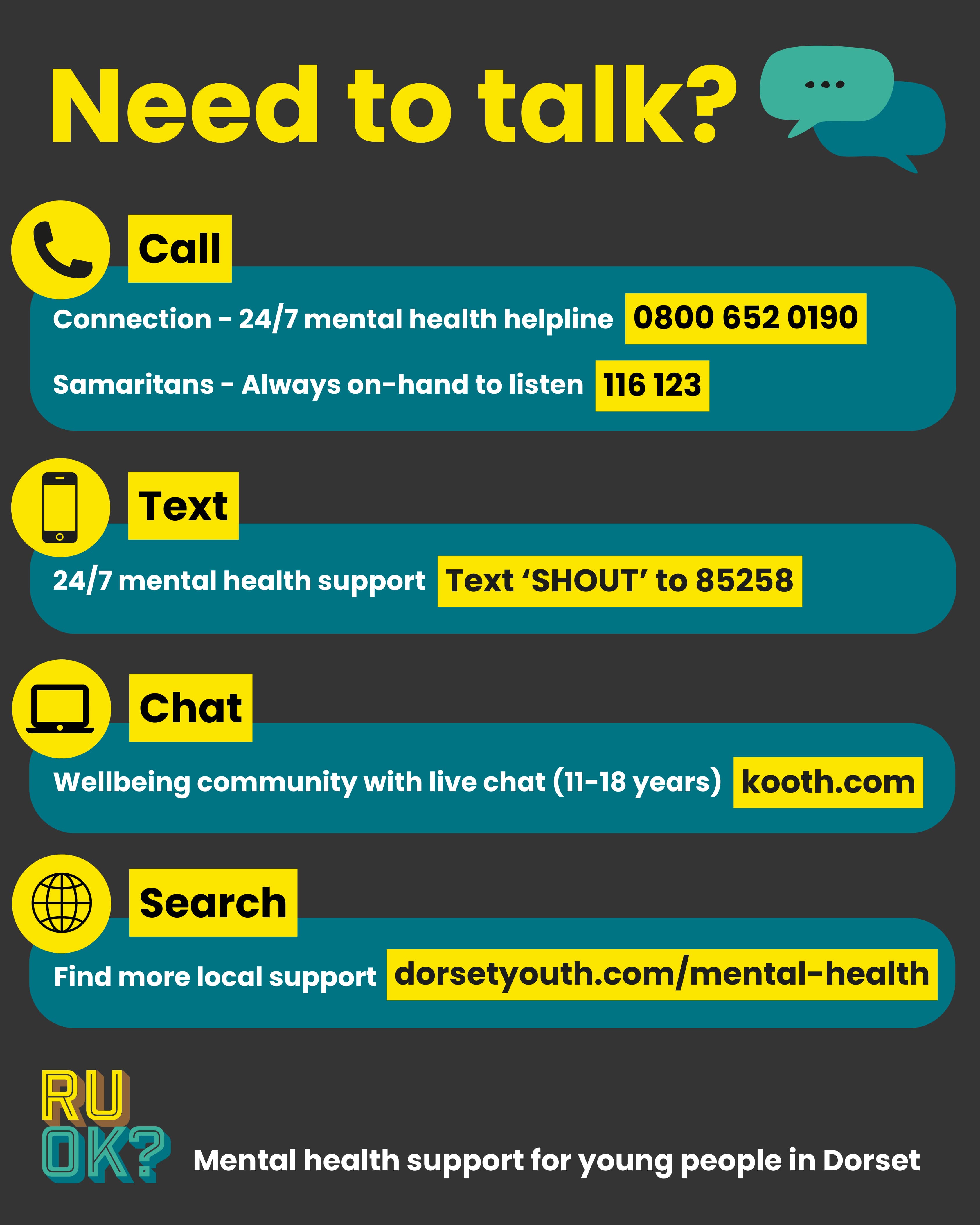 We want as many children and young people in Dorset to know where to go for mental health support. Help make sure they have this information to hand by saving, screenshotting and sharing our infographic.